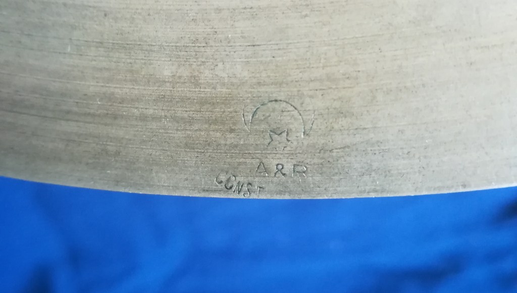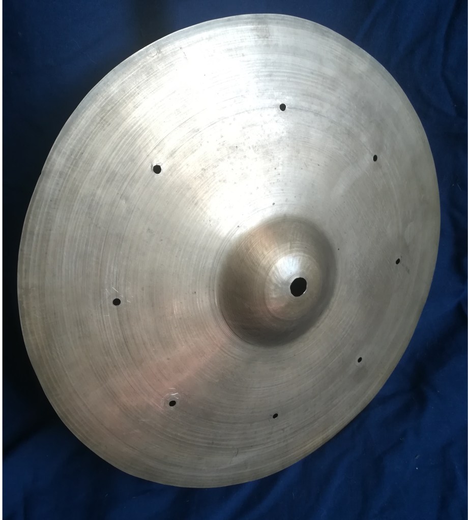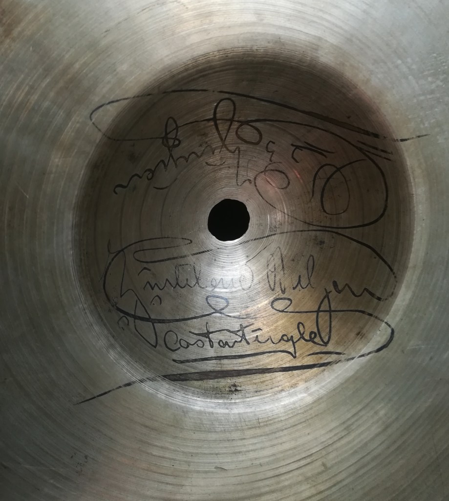 The cymbal I’m going to use as the basis for this article is a genuinely old instrument, presumably authentically Turkish-made judging by its stamp – although evidently not a product of the famous K. Zildjian Co., unlike the verifiable old ‘K’ from Part 1. Today’s cymbal was actually given to me a few years ago as part-payment for a day’s recording session. The musician who’d hired me had somehow acquired it from somewhere, and as a non-drummer himself had no practical use for it – but knew it was old, interesting and precious! It’s a little over twelve inches in diameter and weighs 410g – the same size as the old K. Zildjian from Part 1, but almost half its weight! Unlike the other cymbal it also shows a pretty consistent shape and profile, the result of improvements made in cymbal companies’ manufacturing processes during the intervening years. However, similar to the old K the distinguishing maker’s stamp has been partially worn away and appears so near to the edge of the cymbal that the bottom of the monogram is missing – although a classic crescent moon and star, and the engraved text ‘A&B – Constantinople’ are legible. The underside of the bell bears not only the cymbalsmith’s inked signature but a proliferation of beautiful Turkish script in a stylish, swirling hand. Again, the word Constantinople is clear, which is interesting: whilst the city officially changed its name to Istanbul in 1930 following the establishment of the Turkish Republic in 1922, this doesn’t necessarily mean my cymbal was manufactured earlier than this date, as the switch evidently took some time to become standardised. Yet whilst you could reasonably expect an out-of-date stamp to still carry the old name beyond 1930, it feels unlikely that the smith would willingly keep using it in his own handwriting, unless it was company policy, or simply convention. I’d thus tentatively place its date of manufacture at around 1927-9. At some point, someone has drilled six small holes midway across the bow of the instrument, presumably to add rivets (when I received the cymbal, these bore six small crudely-cut bolts, which I removed).
