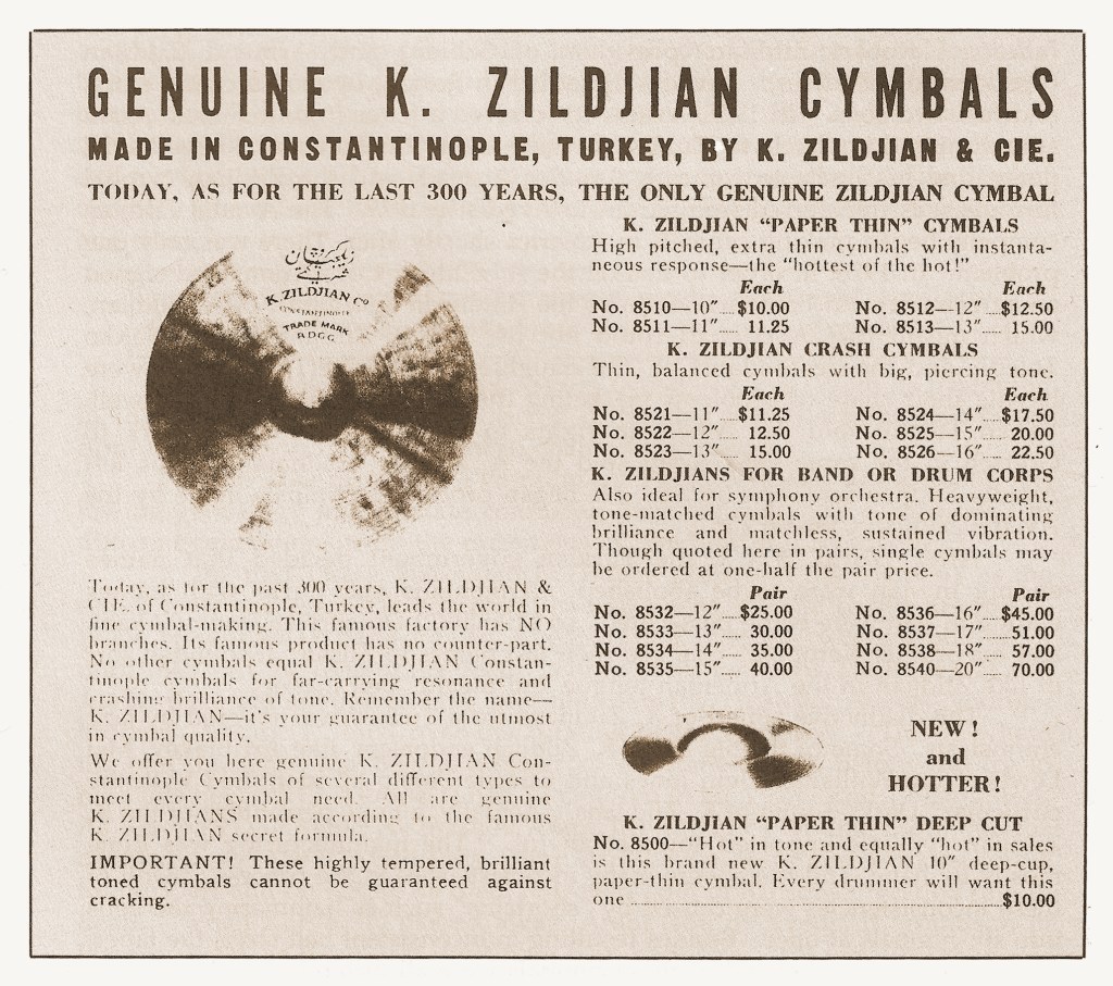 That concludes our look at the evolution of Turkish-style cymbals during the 1920s – over the course of two articles we’ve seen their rise in the nascent Jazz Age and gradual development from weighty and sonorous to light and ‘snappy’. But of course, there were other types of cymbals, with very different sonic characteristics, also being used by drummers in the ‘Twenties alongside these Turkish types. And in ‘Instruments #8’ we’ll have a closer look at those….