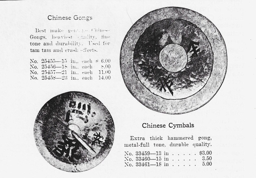 Ragtime and proto-Jazz drummers seem to have favoured these sorts of cymbals almost exclusively during the key developmental period from around 1914-20. Records from this period abound with white-hot explosions and startling clangs, and kits of the time almost universally include one or more Chinese-style instruments, usually mounted upside-down on top of the bass drum shell. Once again, we can only speculate about the exact reason why this was so.