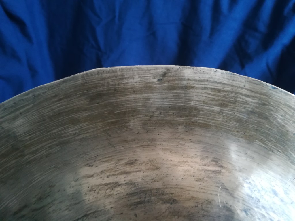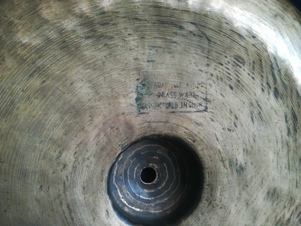 On the opposite side is a rectangular inked stamp of which the English words ‘… BRASS WARE / MANUFACTURED IN CHINA’ are still legible. The unpolished metal inside the bell has an etched spiral design, which again seems to be typical. The metal in general is uneven, scratched and heavily pitted; this is not, it has to be said, a very pretty cymbal to look at. Nor is it necessarily to hear either – although, as we’ll soon discover, that’s sort of the point. When struck, it has all the expected sound character of a smallish Chinese-style instrument: a sharp, aggressive attack and rapid decay providing a short, searing burst of complex, spicy overtones ideal for cutting through a band.