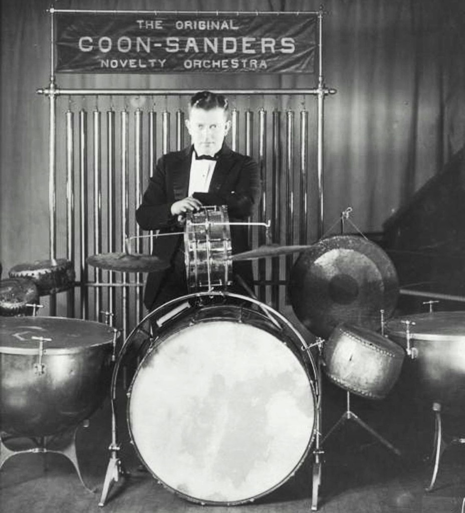 Some would contend that today’s Hero, Carleton Coon, cannot honestly be called a jazz titan: like several other members of our Pantheon including Tony Sbarbaro and Sonny Greer, he performed and recorded exclusively with only one group the whole decade, and even that was a star band rather than a band of stars. When it comes to modern books on jazz history, he and his colleagues rarely receive even a mention, because their milieu – hot, orchestrated dance music – barely qualifies for the modern (post-1945) conception of what jazz is. That we know of, Coon never played improvised solos of his own, neither did he accompany any really seminal improvisers – at least in public. Fred W. Edmiston’s excellent ‘The Coon-Sanders Nighthawks; The Band That Made Radio Famous’ is the only serious text to deal with his legacy in any detail. Yet, if you could ask a young music fan from the mid or late 1920s to name their favourite jazz drummers, his name would surely be among the very first they’d mention – after all, he was, for several important years, one of the most well-known and well-loved drummers in America.
