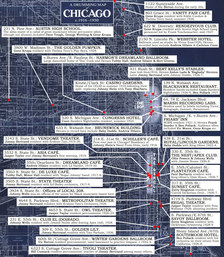 There were also a great many more venues that hosted jazz in the 1920s beyond those listed here, and nearly every hotel, restaurant and movie theatre would have had a drummer of some sort playing at least occasionally. I’ve tried to focus on the places that were really significant for the important Heroes that have featured in these pages so far – or were important for jazz drumming in some other way. Doubtless, as I research more Heroes in the years to come, this map will be expanded and revised.