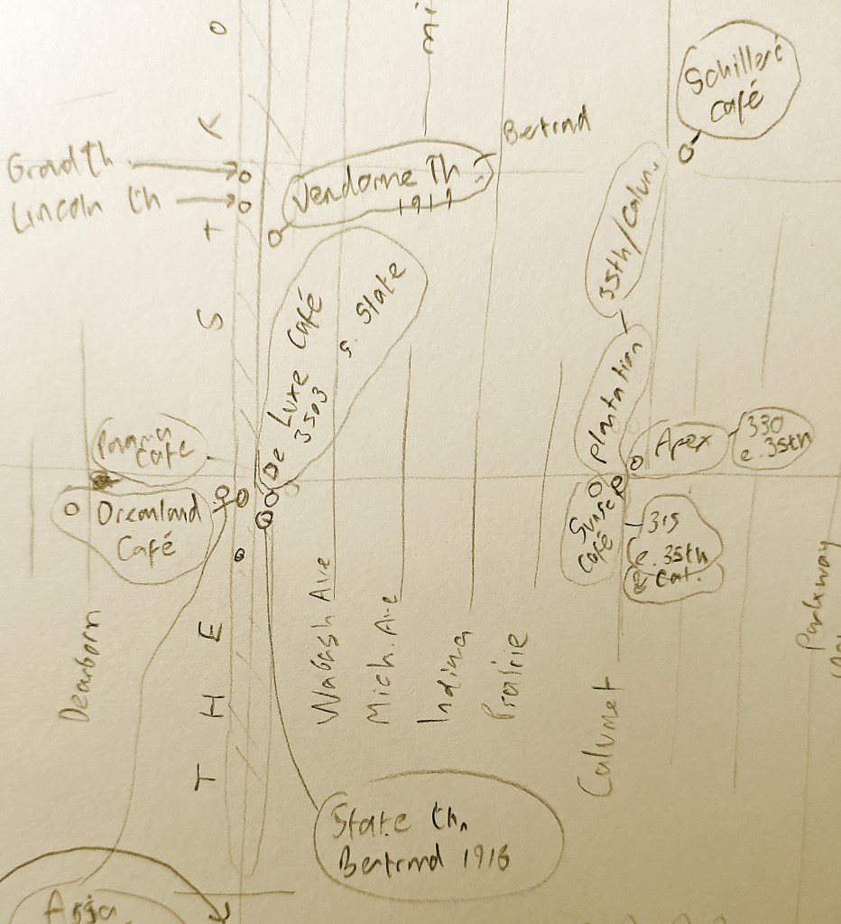 The majority of my little sketches involved small districts (such as the one descibed above) of the city whose legacy looms large over all others when it comes to the development of jazz in the 1920s. New Orleans may have been the birthplace of some of our most important Heroes, and New York may have been where many of them had ended up by 1930. Yet neither city can seriously rival Chicago’s claim as the true epicentre of the music during the Jazz Age’s frantic first decade, from around 1918-28. Now initially, my maps of various bits of Chicago were rough and made purely for my own reference, to help contextualise the music scene in the Toddlin’ Town and conceptualise the geographical relationship between the various entertainment neighbourhoods such as the Loop, the Stroll, and certain streets immortalised in band names and song titles, such as State Street, Wabash Avenue and the Parkway. Over time, however, it dawned on me that perhaps a more elaborate and neatly-presented version might be a real asset to DITT readers, and help to place many of our Heroes’ lives and careers into a clearer context.